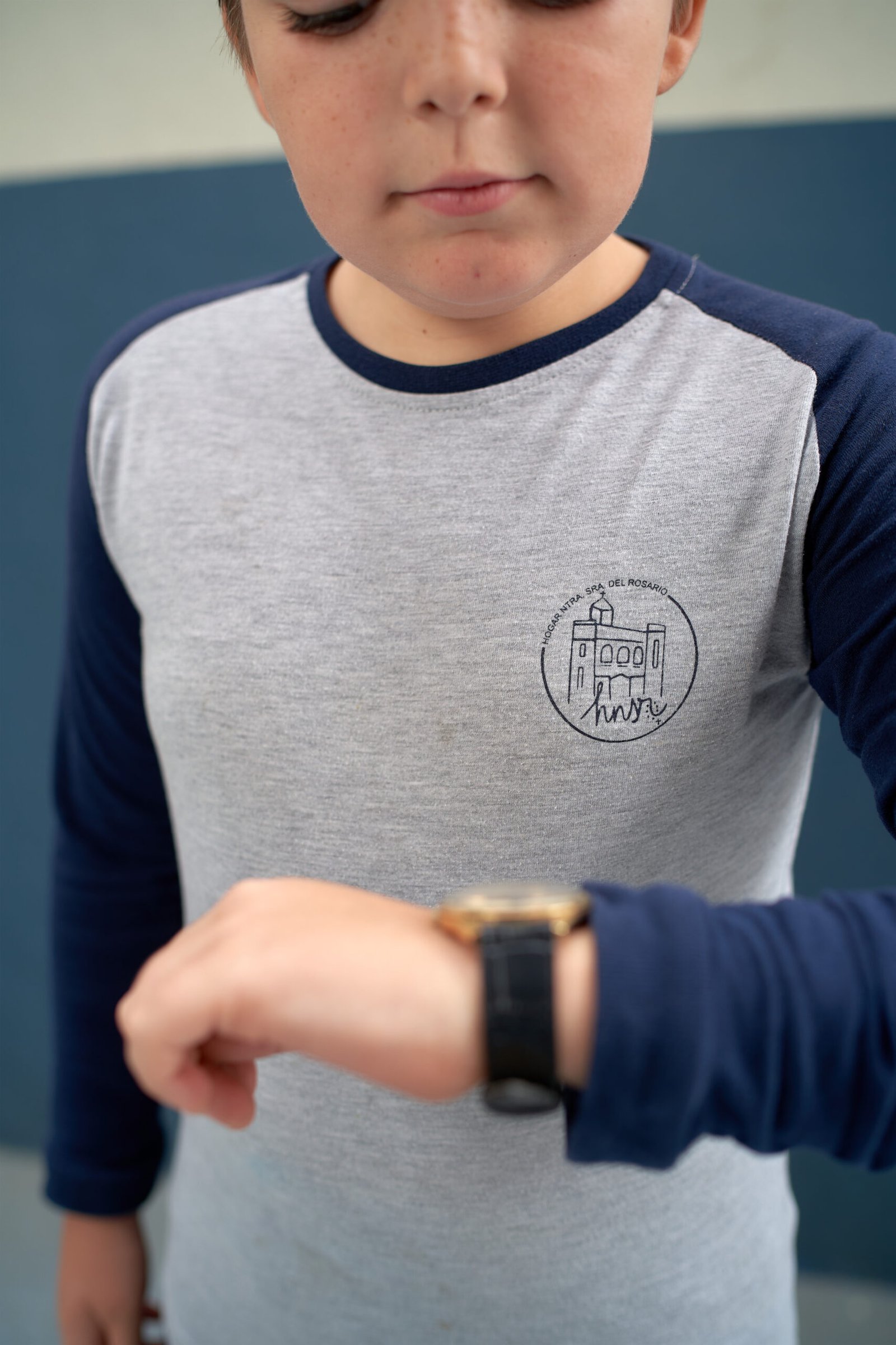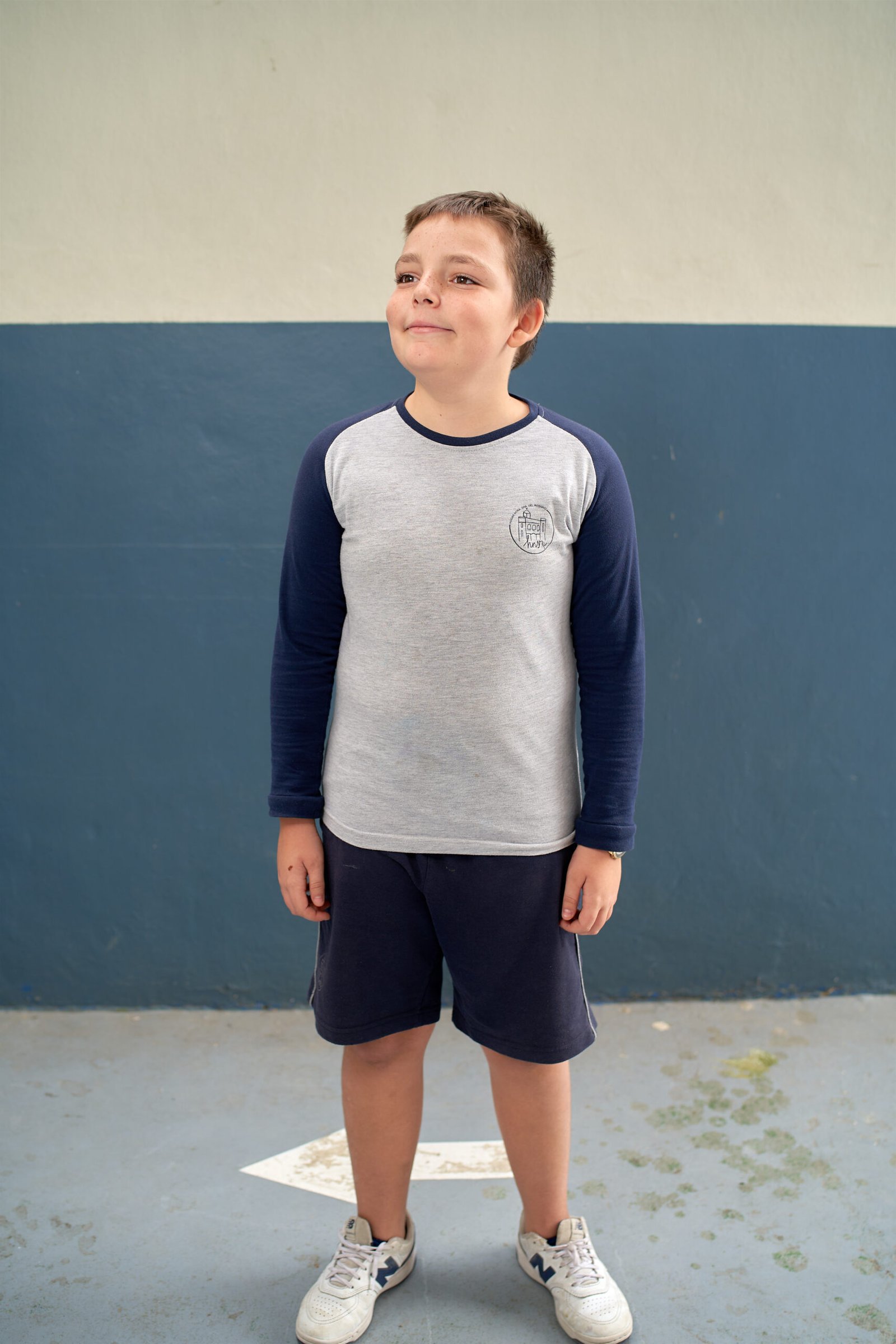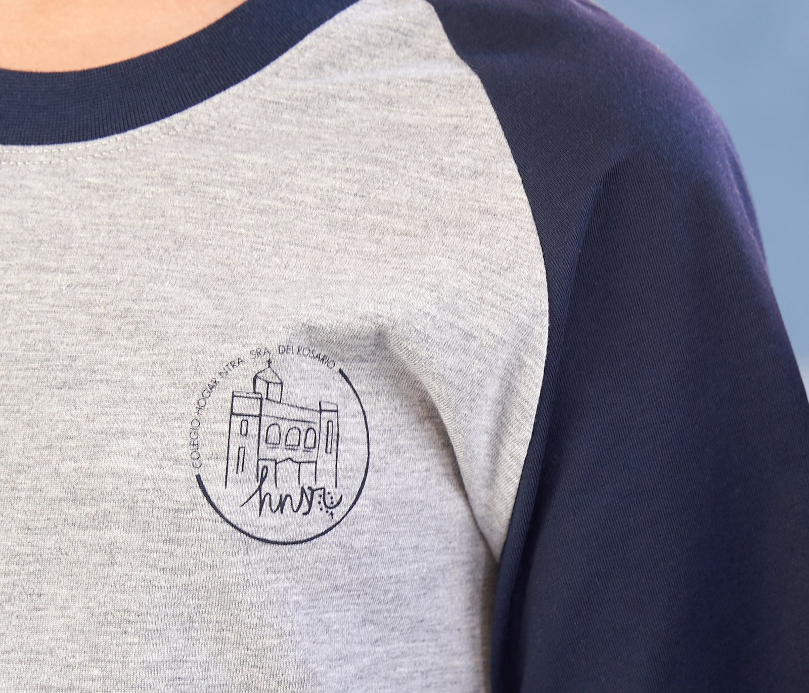 Camiseta manga corta beisbolera color gris y mangas azul marino 50% poliéster 50% algodón. Serigrafiada en delantero y espalda con el logotipo del centro educativo.