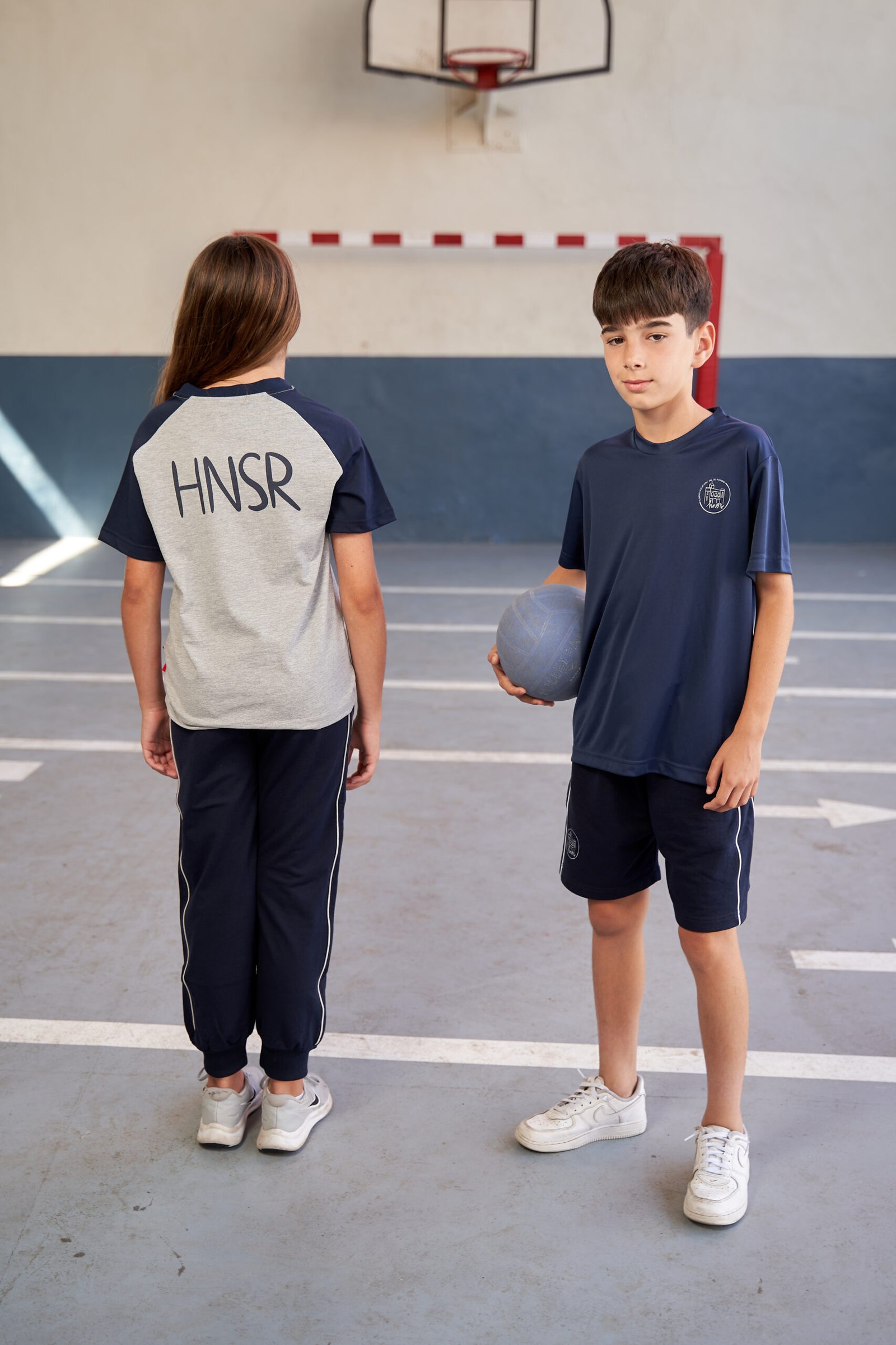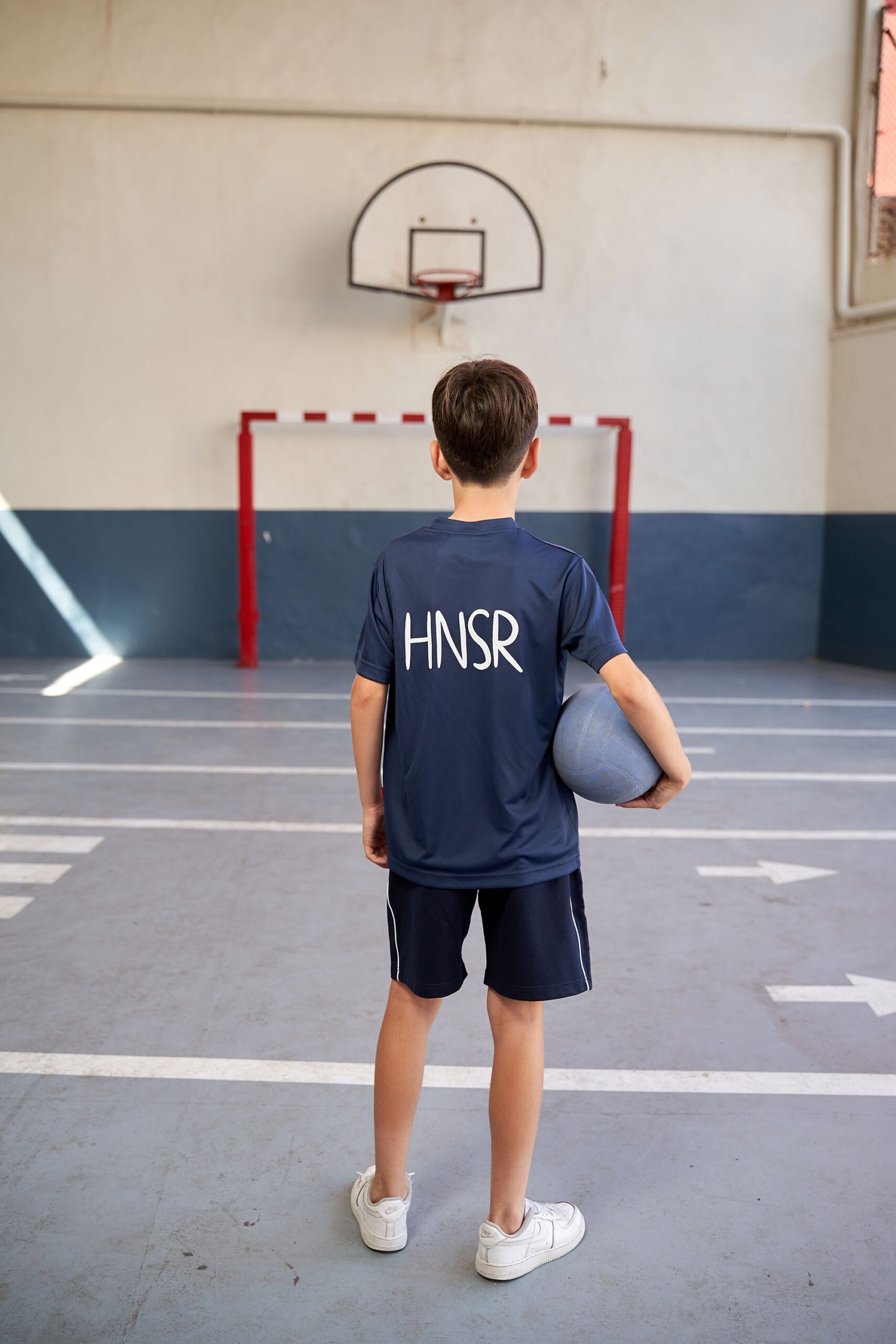 Camiseta manga corta técnica azul marino, 100% poliéster. Serigrafiada en delantero y espalda con el logotipo del centro educativo. Prenda imprescindible para las sesiones de educación física a partir de 5º de primaria.