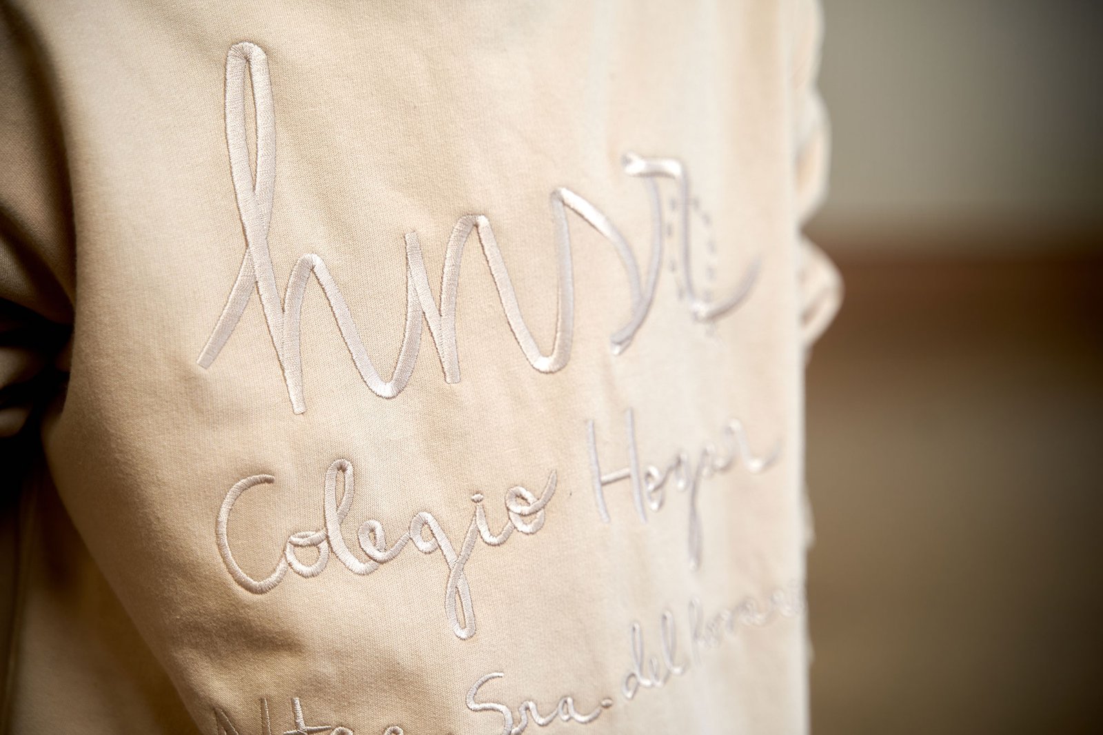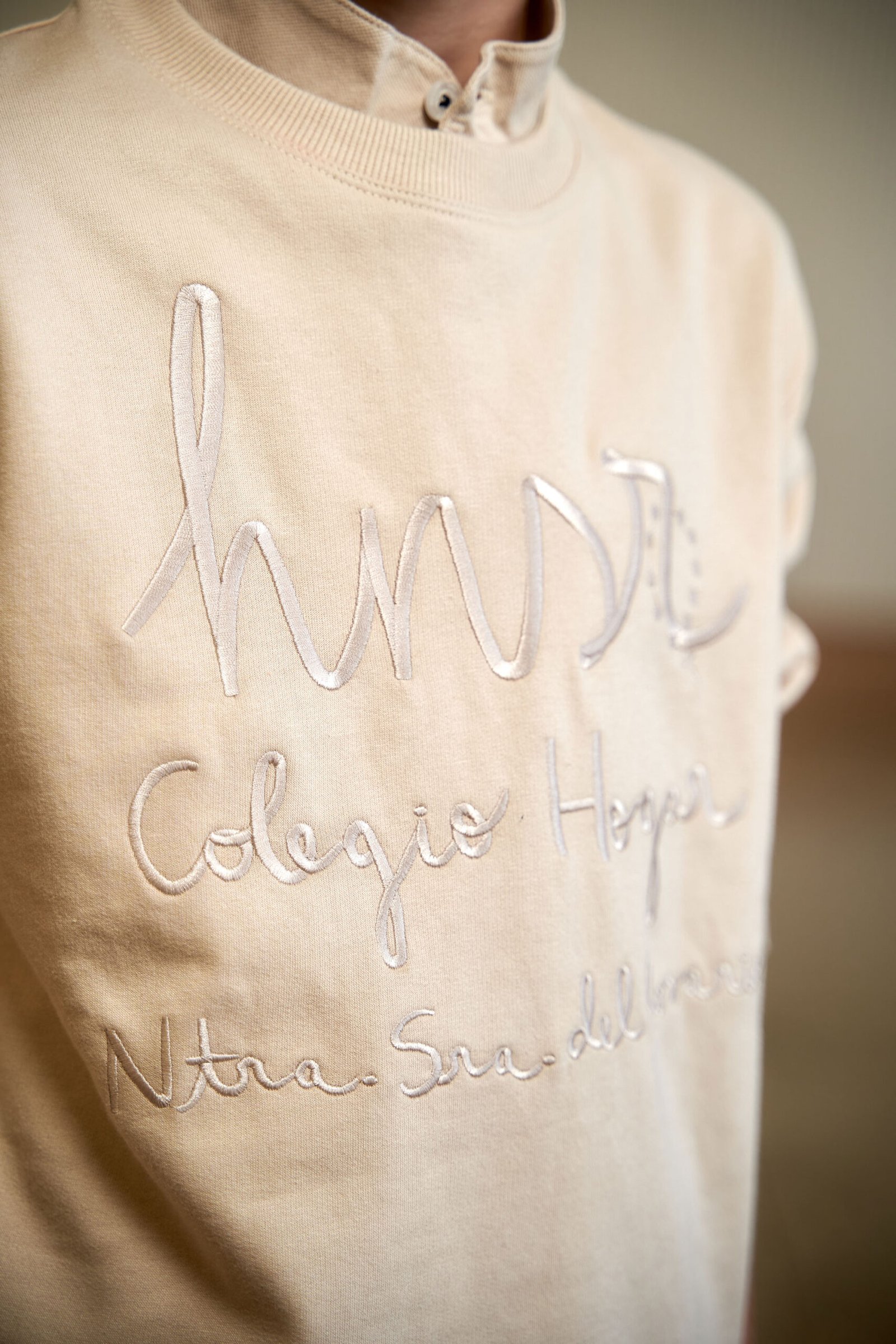 Sudadera beige de manga larga, confeccionada en tela suave y cómoda, ideal para el uso diario. Incluye bordado discreto en el mismo tono con el nombre de la escuela. Su diseño clásico permite libertad de movimiento, brindando calidez y durabilidad, perfecta para estudiantes en actividades escolares y cotidianas.